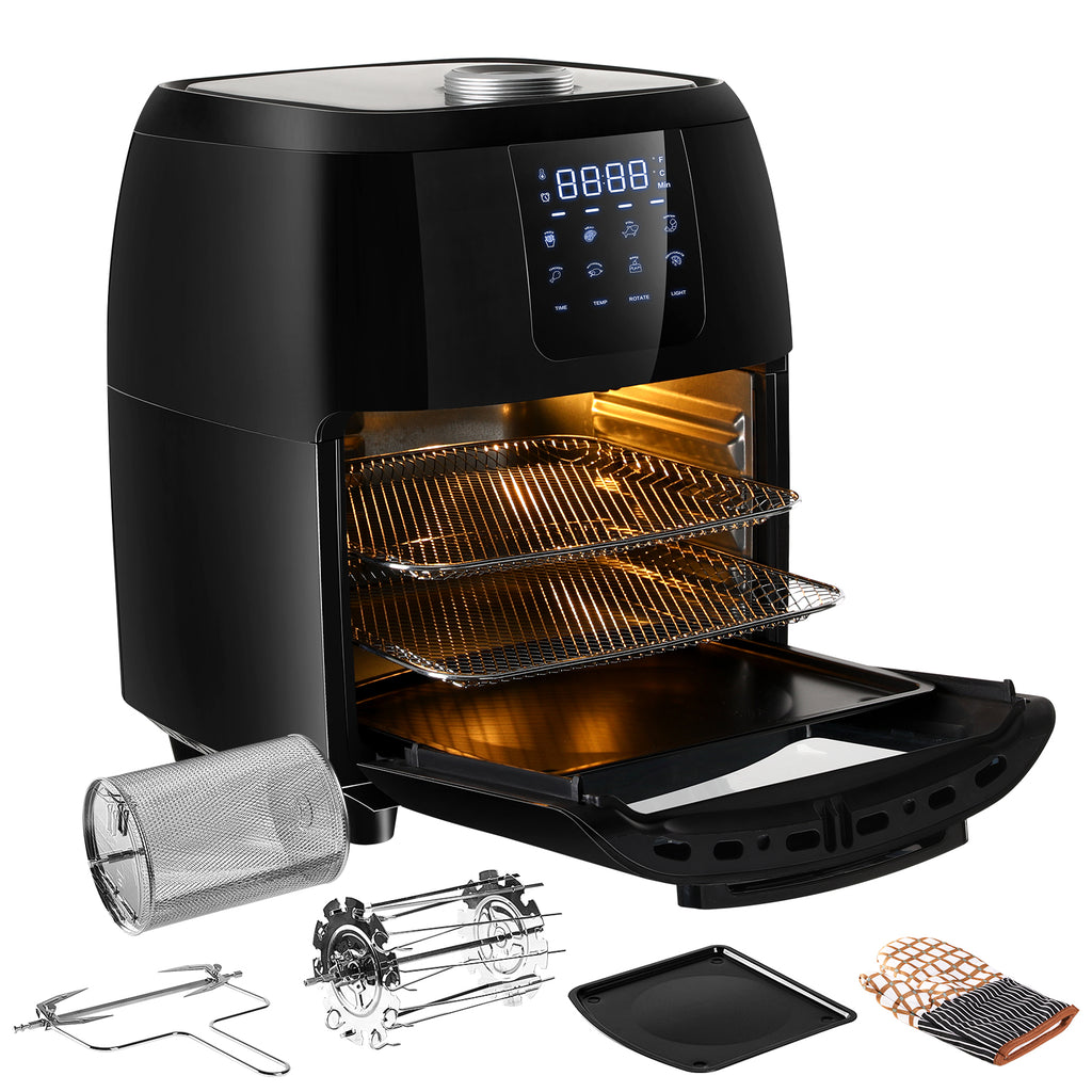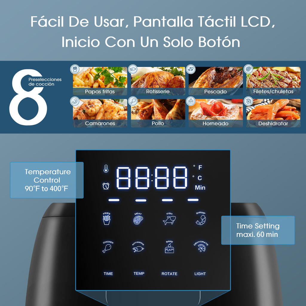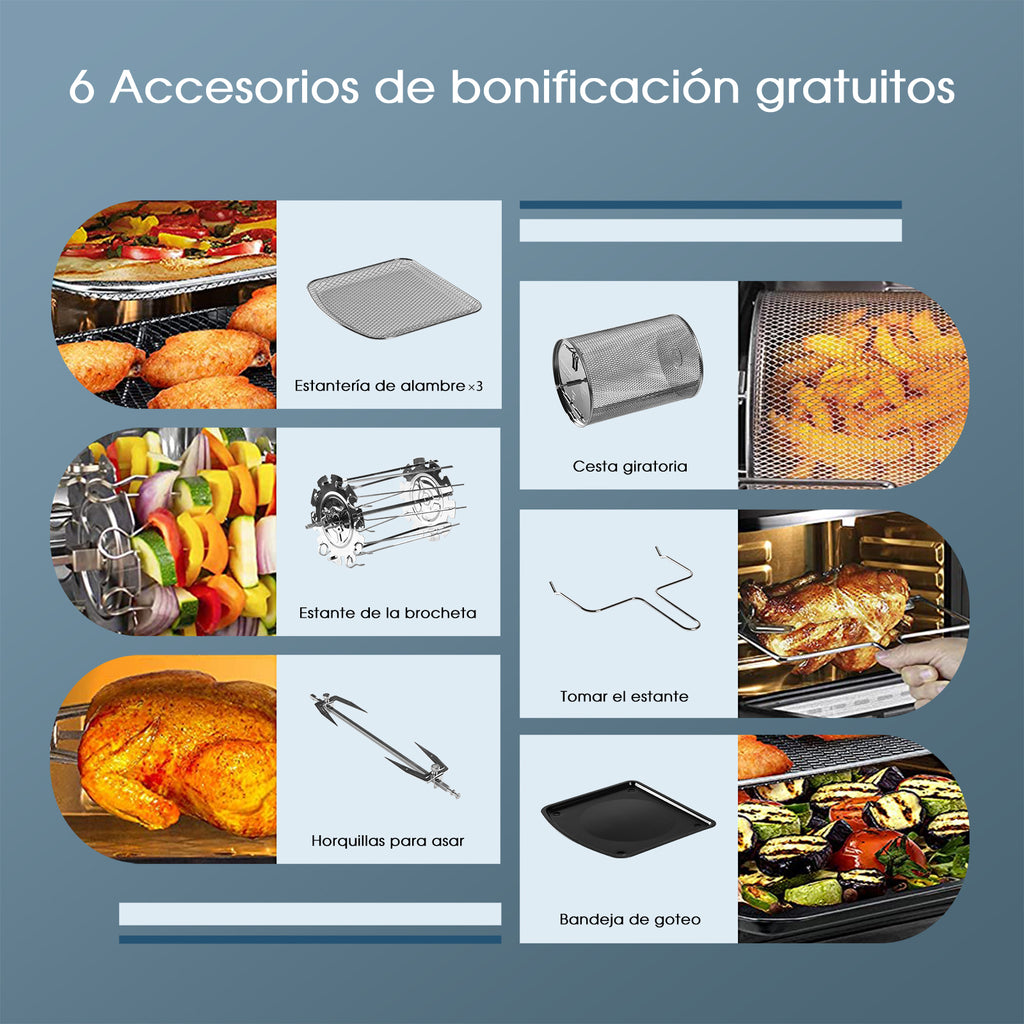 Su capacidad te permite cocinar para toda la familia o para tu fiesta. Asa un pollo entero, hornea un pastel o pizza, frutas y verduras deshidratadas, patatas fritas, etc., para que los usuarios elijan libremente. Las opciones son infinitas.