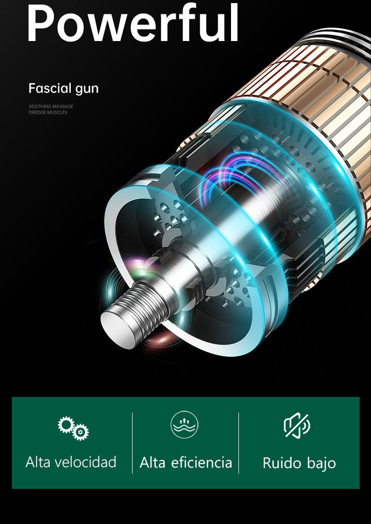 1. 6 Cabezales de Masaje Reemplazables.Se pueden usar 6cabezales de masaje diferentes con 6 niveles de velocidad, puede cambiar la velocidad del masajeador muscular eléctrico según sea necesario.