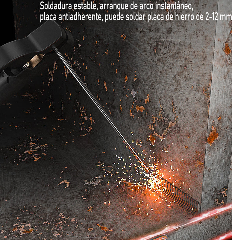 👩🏭TECNOLOGÍA ANTI STICK: Evita que el electrodo se pegue a la pieza mientras se esta realizando la soldadura. Hot-start Facilita el comienzo de cada soldadura incrementando la intensidad al inicio de cada electrodo. Función de gran apoyo sobre todo cuando se utilizan electrodos difíciles. Este dispositivo facilita la soldadura de electrodos especiales ya que mantiene la aportación de material del electrodo al baño de fusión de forma constante evitando que el arco se corte.
